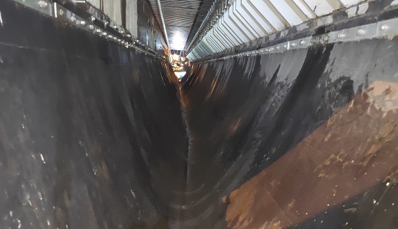 蕪湖長江三橋主橋0#、5#墩處采用最大伸縮量為1200mm的梳齒形伸縮縫,齒間距約50mm,通過橡膠止水帶收集雨水后排至兩側(cè)雨水斗進(jìn)入雨水系統(tǒng)。自三橋通車以來,車輪及雨水裹挾泥沙由梳齒間隙進(jìn)入伸縮縫,止水帶內(nèi)存有不少泥沙和雜物。隨著時間的推移,止水帶內(nèi)積沙積泥載荷增大,將會對正下方高鐵運行產(chǎn)生威脅。為及時消除安全隱患,大橋公司路產(chǎn)安全部養(yǎng)護(hù)人員組織外協(xié)單位多次前往現(xiàn)場確定清理方案及安全防護(hù)措施,并在公司領(lǐng)導(dǎo)帶領(lǐng)下及時對接鐵路蕪湖工務(wù)段,申請高鐵運行天窗期開展專門清理工作。